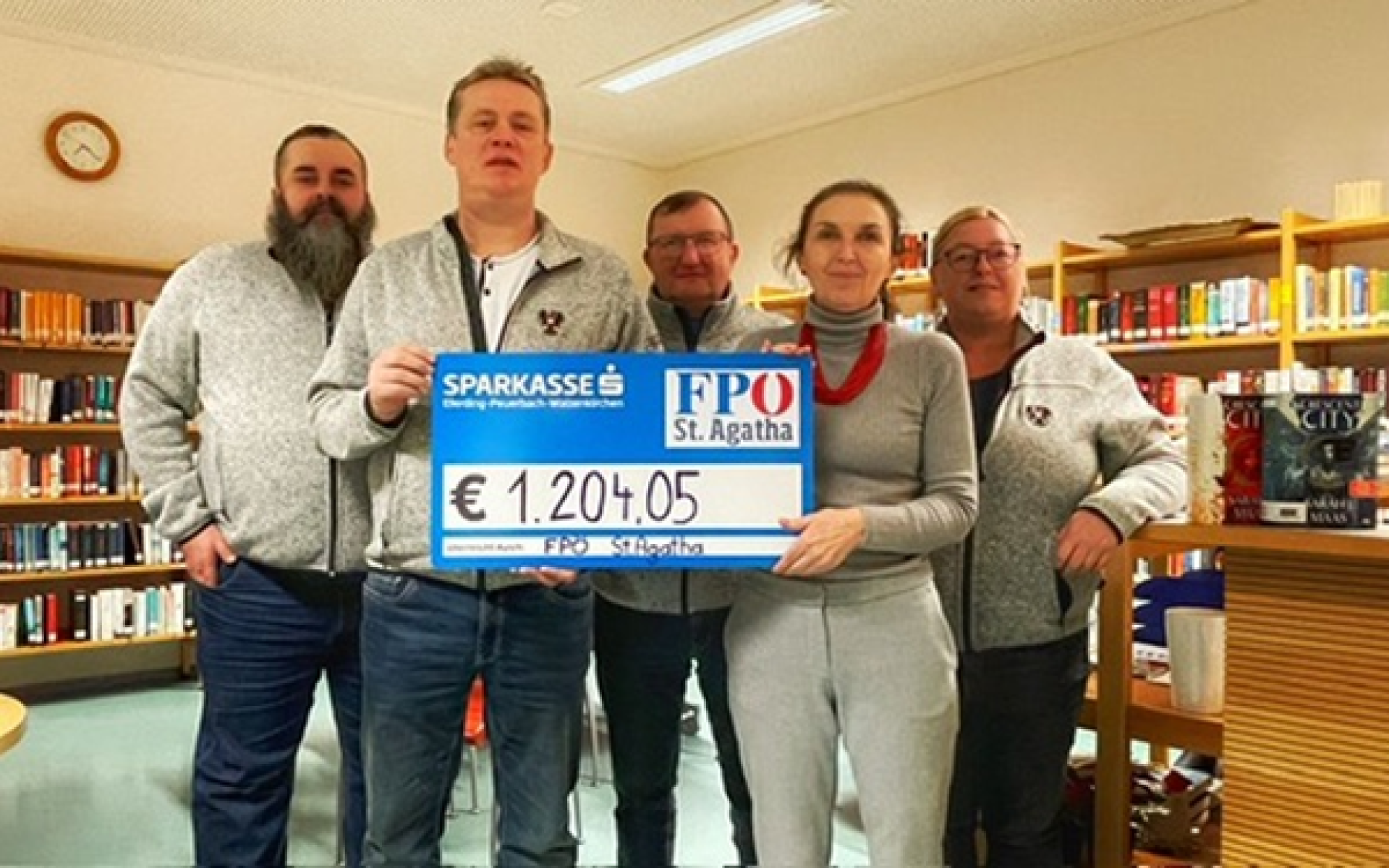 Das Team der Gemeindebücherei bedankt sich sehr herzlich bei der FPÖ St. Agatha für die großzügige Unterstützung von EUR 1.204,05. Diese Summe ist der Gesamterlös des von der Ortspartei veranstalteten Punschstandes vom vergangenen Dezember. Hiermit unterstützt die FPÖ bereits zum dritten Mal die örtliche Bücherei!